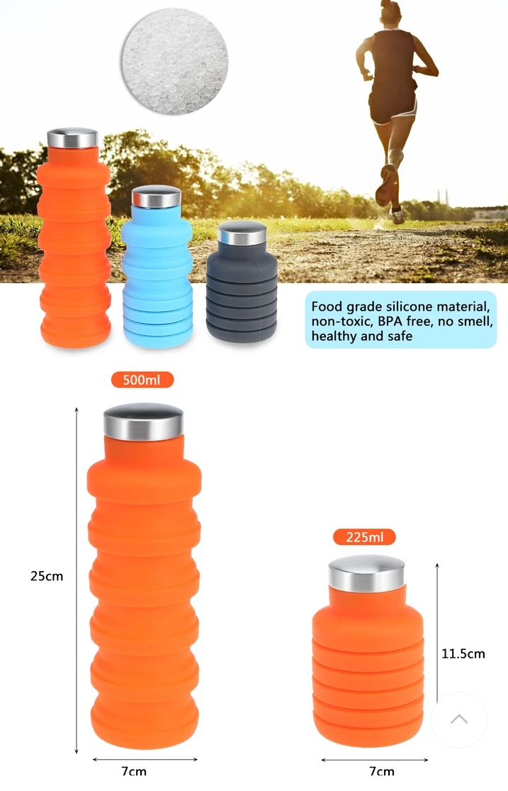 ☑ Flexible bottle☑ Eco-friendly ☑ wide mouth nd fit ice cubes ☑ Plastic free ☑ silicon bottle collapses to about 2/3 its size when you're done drinking