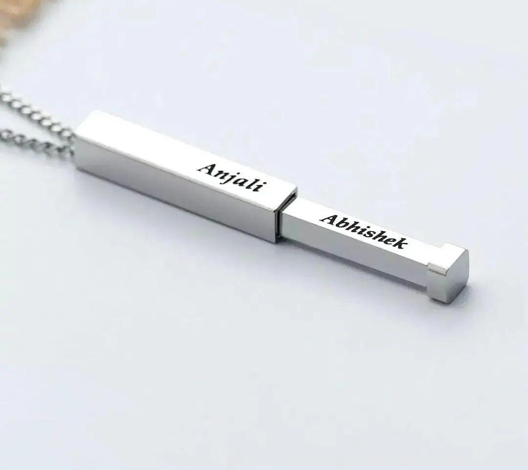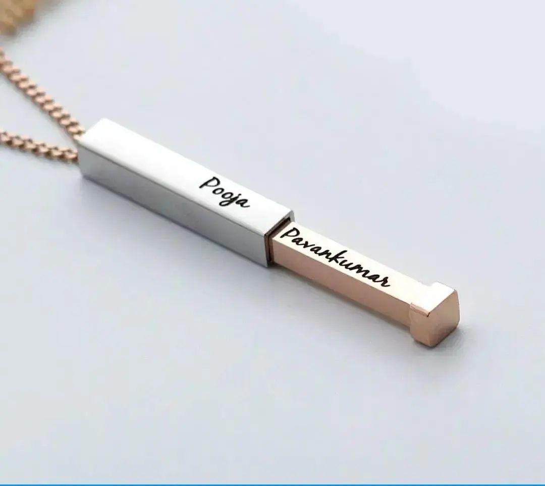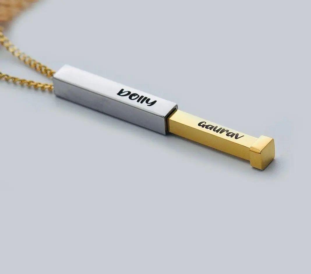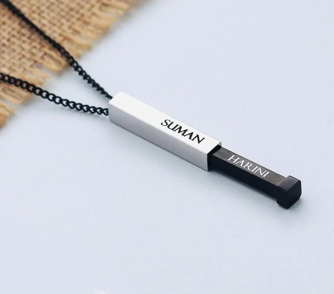 Perfect for both men and women, this pendant slips easily into everyday wear, making it a thoughtful gift for anniversaries, birthdays, or “just because.” Its clean bar design offers space for initials, coordinates, or a small word — ideal for personalization. Delivered in a premium box-packed gift-ready form, it’s a small package with big emotion.