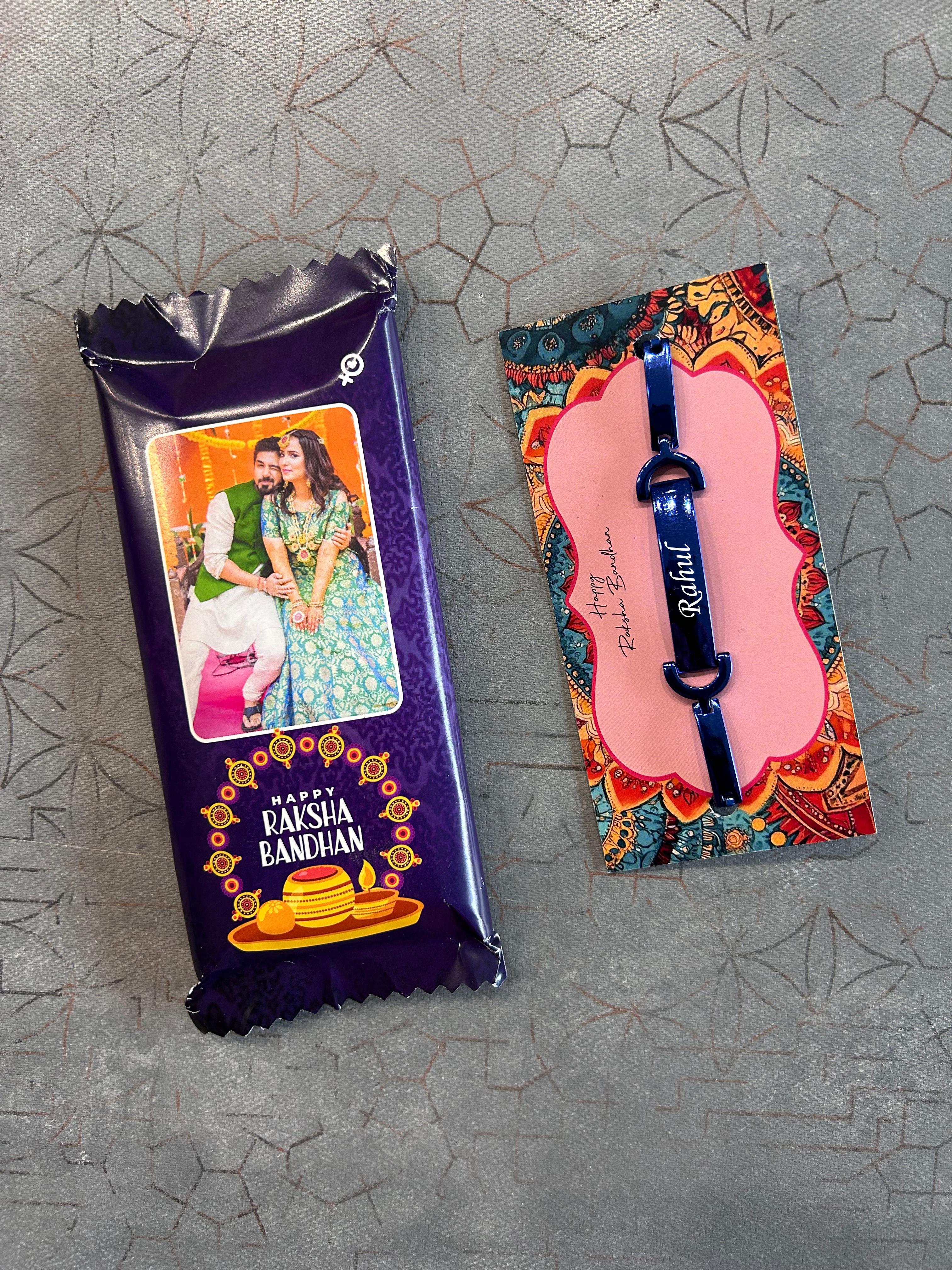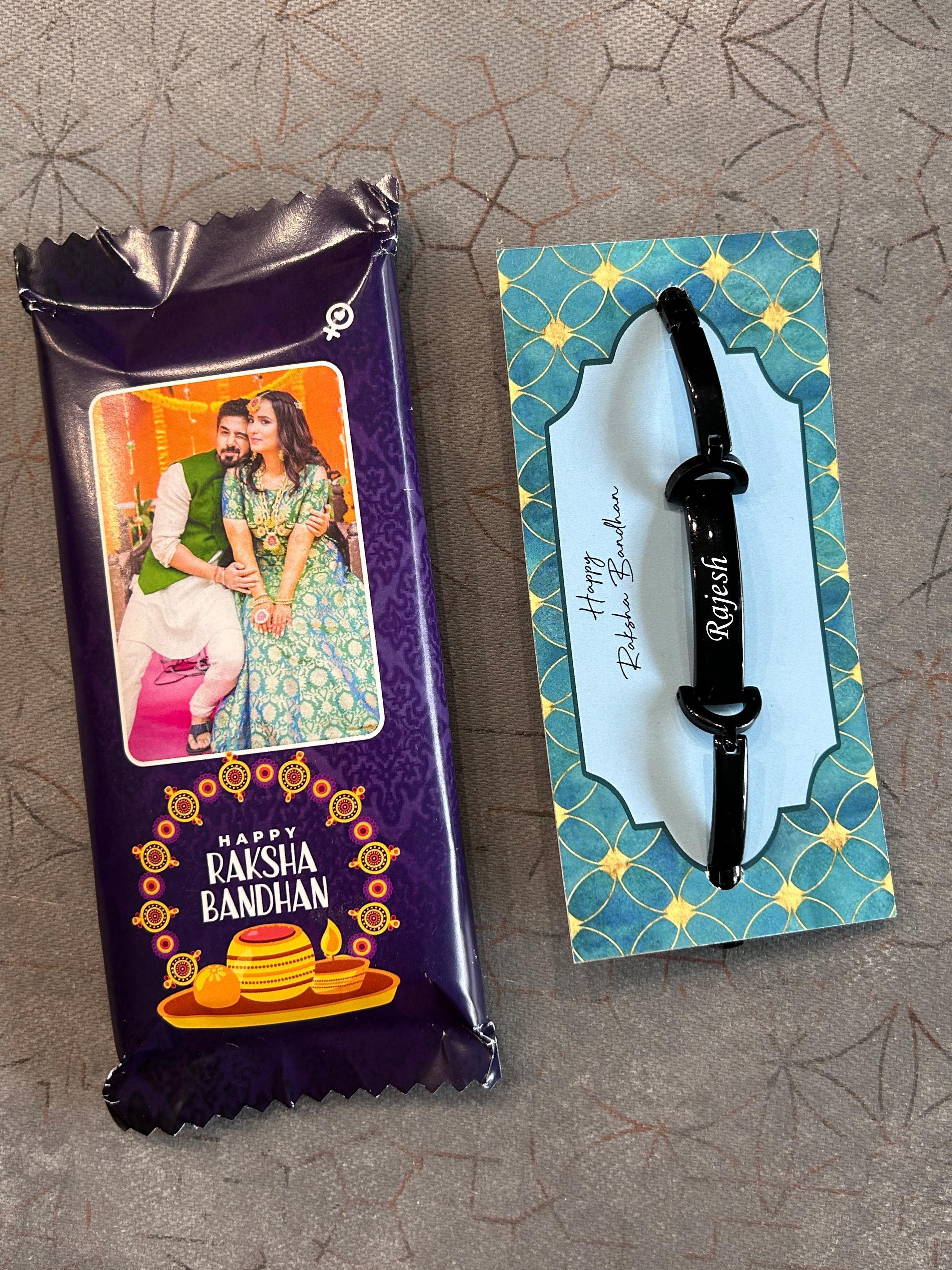 Make this Rakshabandhan truly unforgettable with our Personalised Rakhi Combo, designed to add a heartfelt twist to your celebrations. This combo includes a beautifully customised bracelet with your brother’s name and a mini Dairy Milk Silk chocolate with your photo printed on the wrapper — a delightful treat for the sweetest sibling bond.