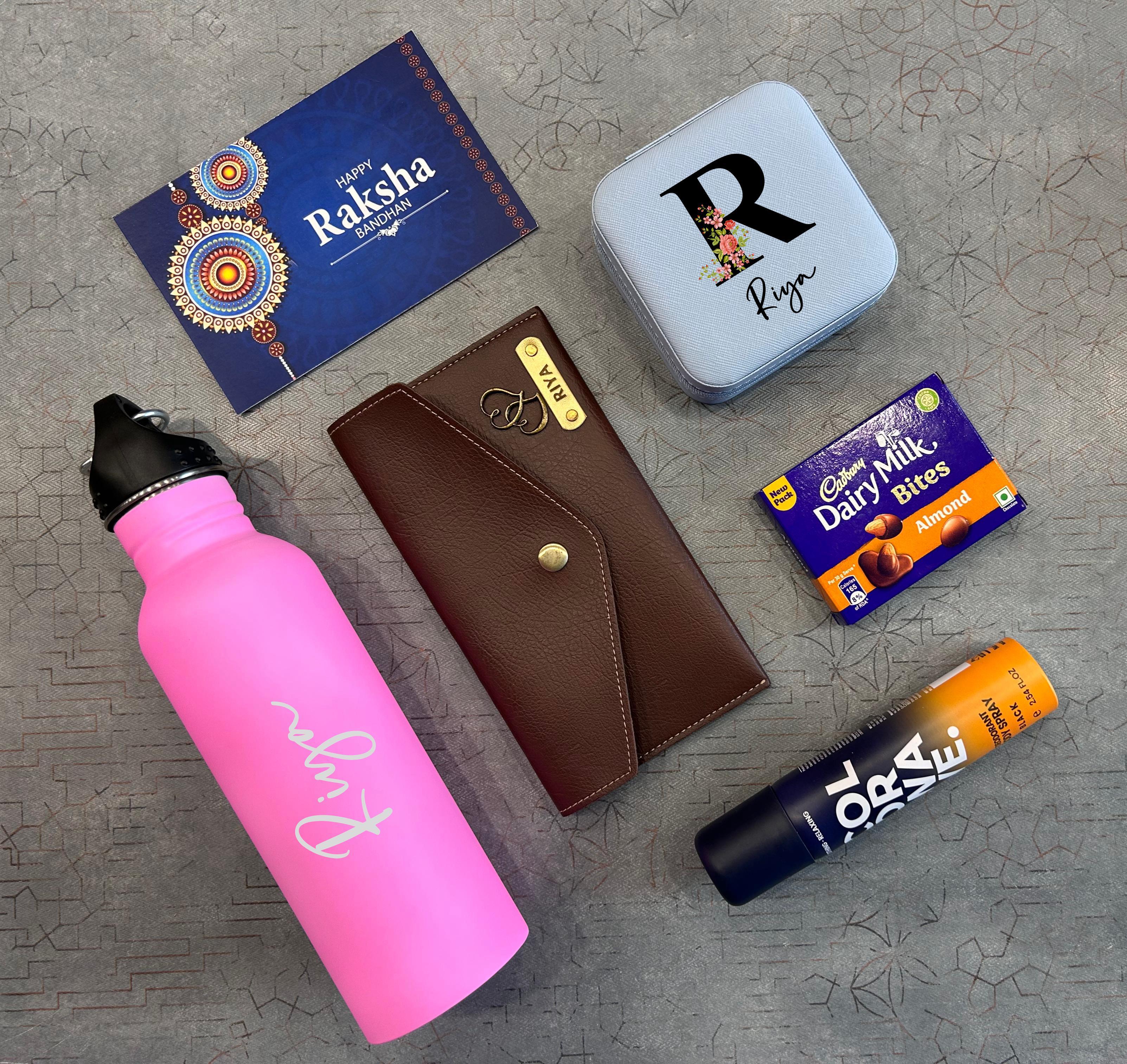 Celebrate your sister this Rakshabandhan with a thoughtfully curated Sister Combo Hamper. Packed with love, style, and utility, this gift set features a customisable temperature bottle and a sleek Nexon minimal clutch — both with name personalisation options. Add a jewellery box, Dairy Milk Bites, and Rakhi cards, and you’ve got the perfect mix of sweetness and surprise.