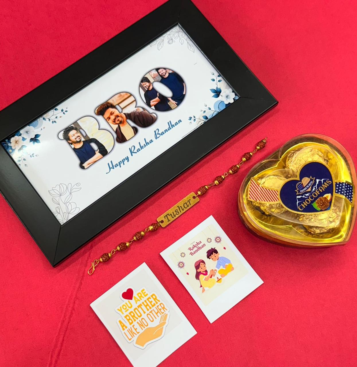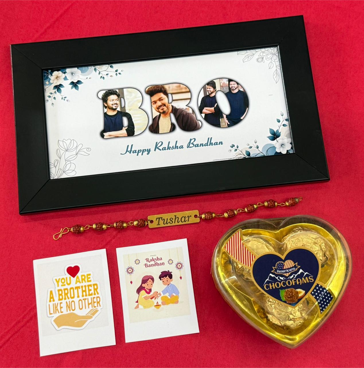 Celebrate the bond of siblinghood with our thoughtfully curated Raksha Bandhan Combo, designed to make your brother feel truly special. This combo includes a customised photo frame, a name rakhi, delicious chocolate, and 2 themed Rakhi cards—everything you need for the perfect festive surprise.