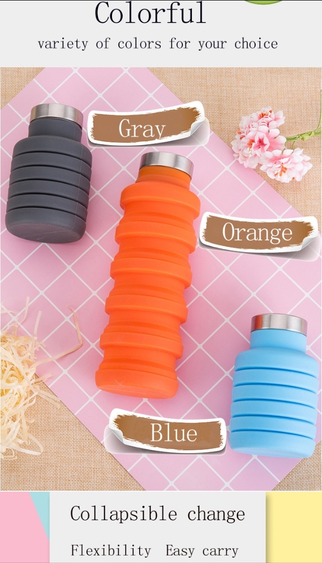 ☑ Flexible bottle☑ Eco-friendly ☑ wide mouth nd fit ice cubes ☑ Plastic free ☑ silicon bottle collapses to about 2/3 its size when you're done drinking