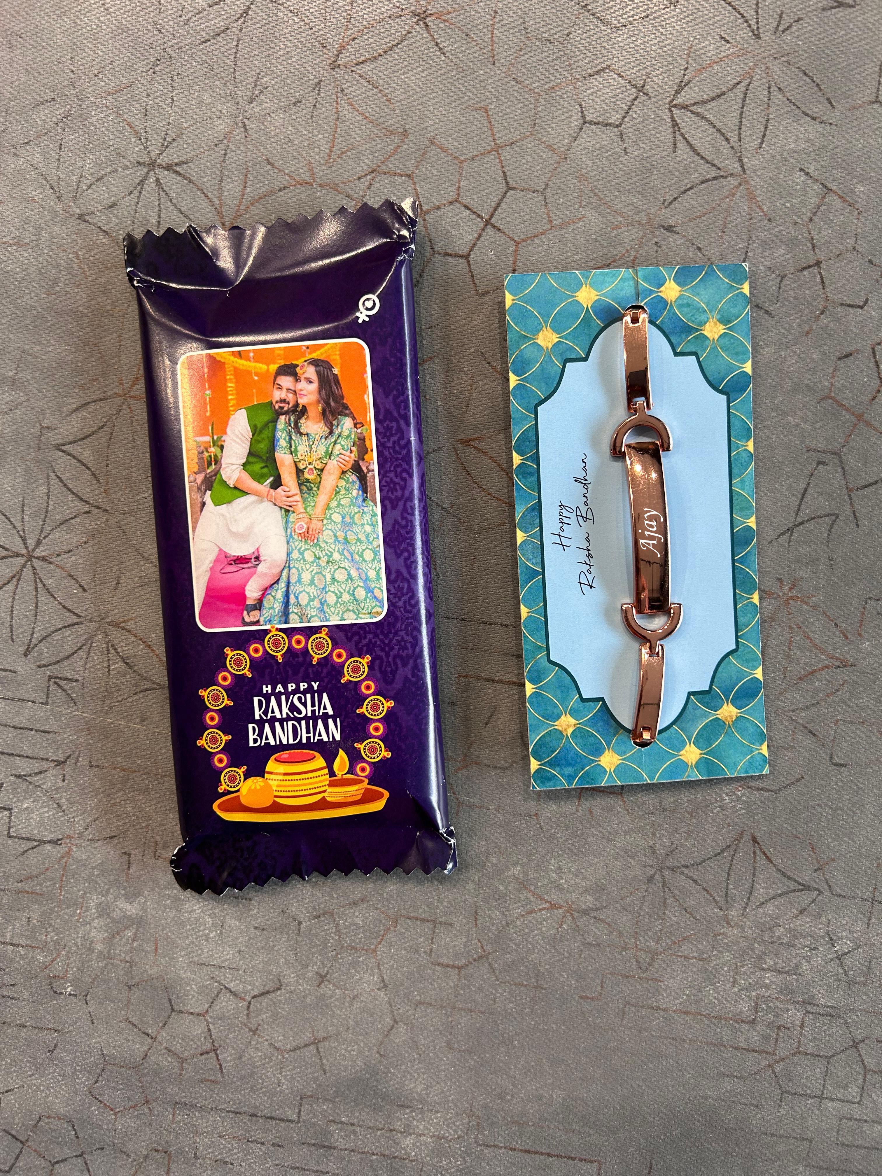 Make this Rakshabandhan truly unforgettable with our Personalised Rakhi Combo, designed to add a heartfelt twist to your celebrations. This combo includes a beautifully customised bracelet with your brother’s name and a mini Dairy Milk Silk chocolate with your photo printed on the wrapper — a delightful treat for the sweetest sibling bond.