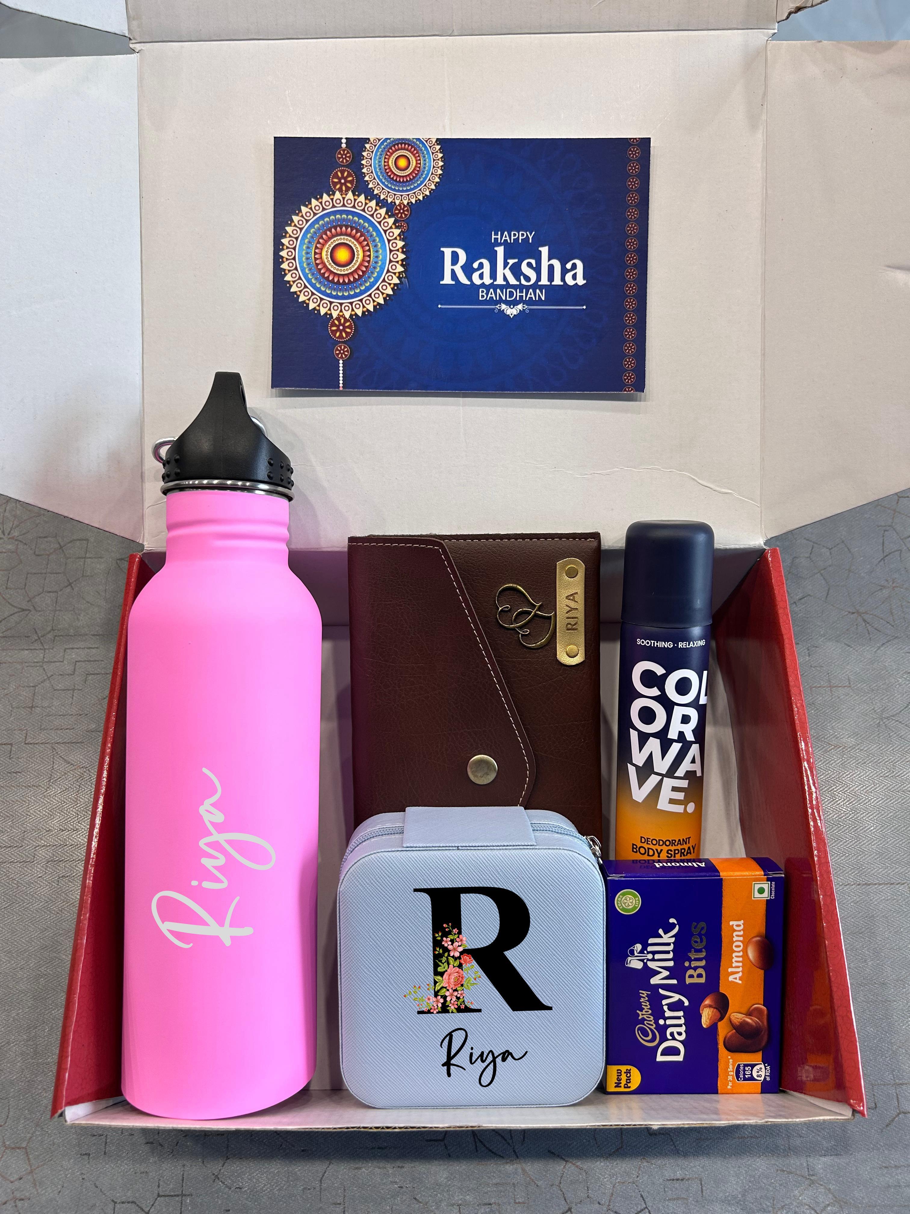 Celebrate your sister this Rakshabandhan with a thoughtfully curated Sister Combo Hamper. Packed with love, style, and utility, this gift set features a customisable temperature bottle and a sleek Nexon minimal clutch — both with name personalisation options. Add a jewellery box, Dairy Milk Bites, and Rakhi cards, and you’ve got the perfect mix of sweetness and surprise.