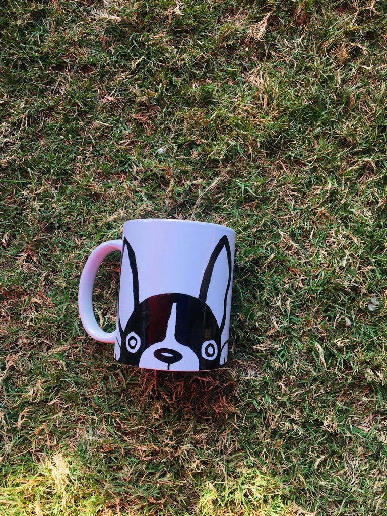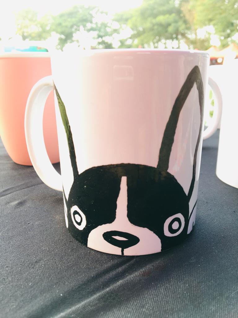 Mugs are hand painted. This can be customised with any design,name initials, logo or any idea which you wish.